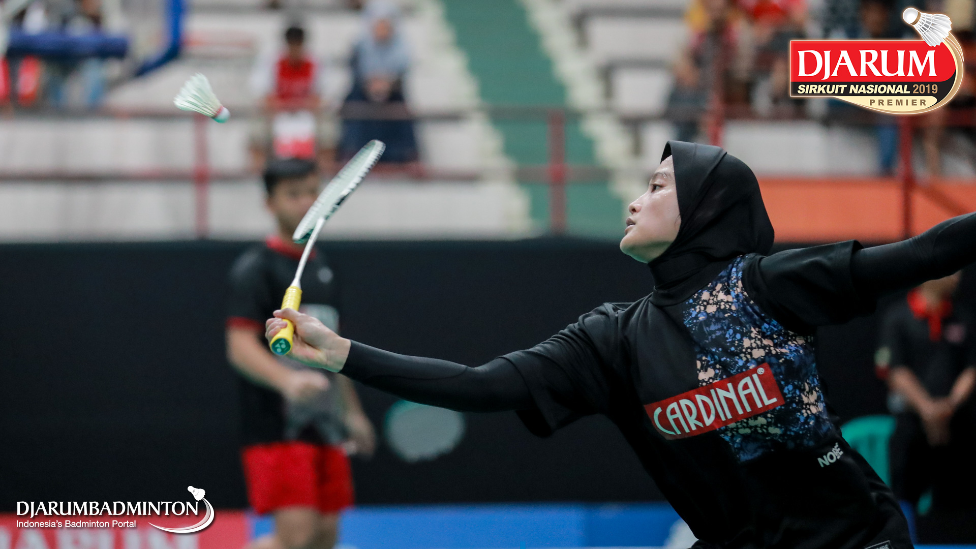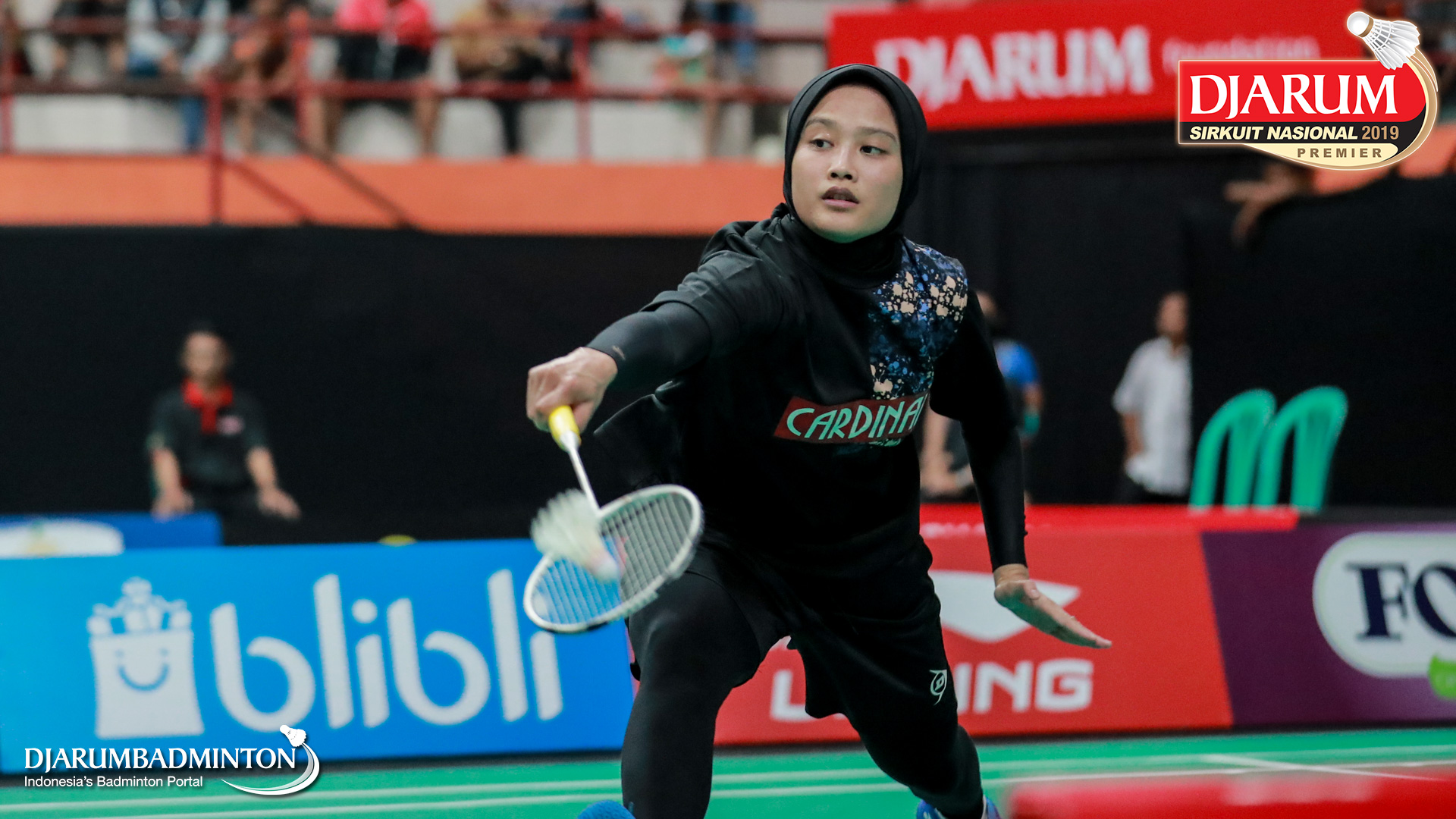 Hanna Ramadini (Mutiara Cardinal, Bandung) bersiap menyambut shuttlecock