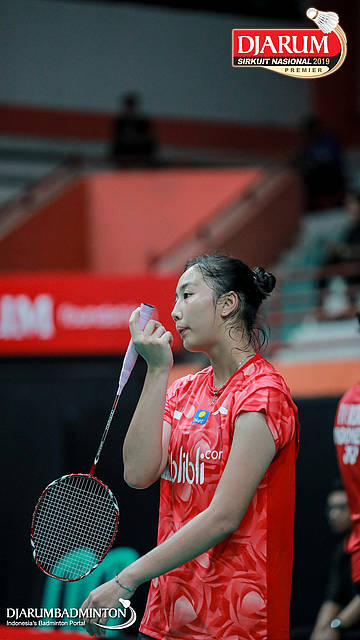 Febby Valencia Dwijayanti Gani (Pelatnas PBSI) meniup tangannya
