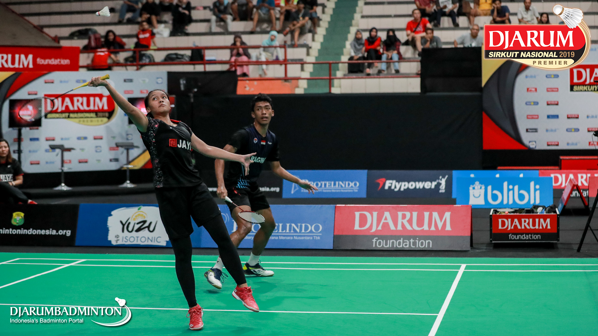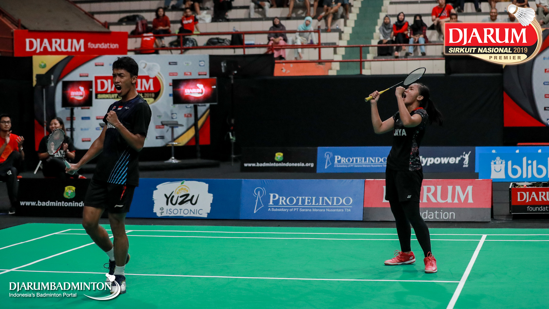 Selebrasi kemenangan Moh Rezky Alfarez+Denisa Dwi Syawaliah Budiani (Sekolah Khusus Olahraga Ragunan+Jaya Raya Jakarta)