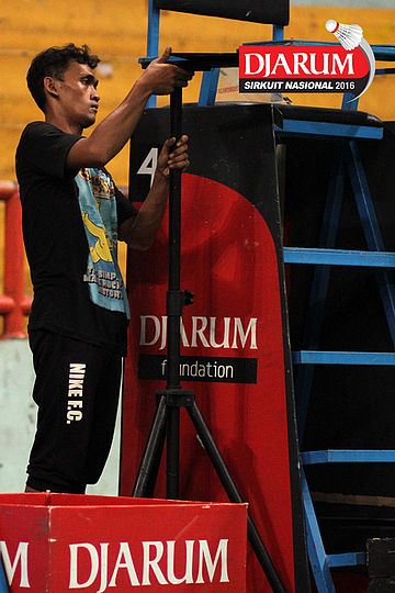 Salah satu pekerja pekerja sedang memasang perangkat Live Score