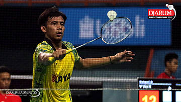 Mochamad Rehan Diaz (Mutiara Cardinal) mengembalikan shuttlecock
