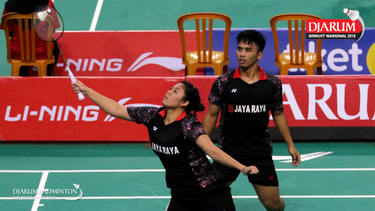 Reza Dwicahya Purnama/Annisya Widya Permatasari (Jaya Raya Jakarta/Mutiara Cardinal) bersiap menyambar pengembalian