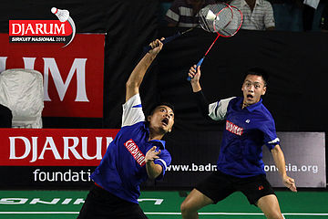 Angga Dian/M. Robby Darwis (Mutiara Cardinal) bersiap menyambar pengembalian tanggung.