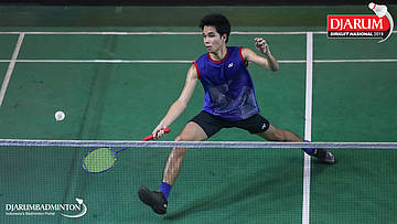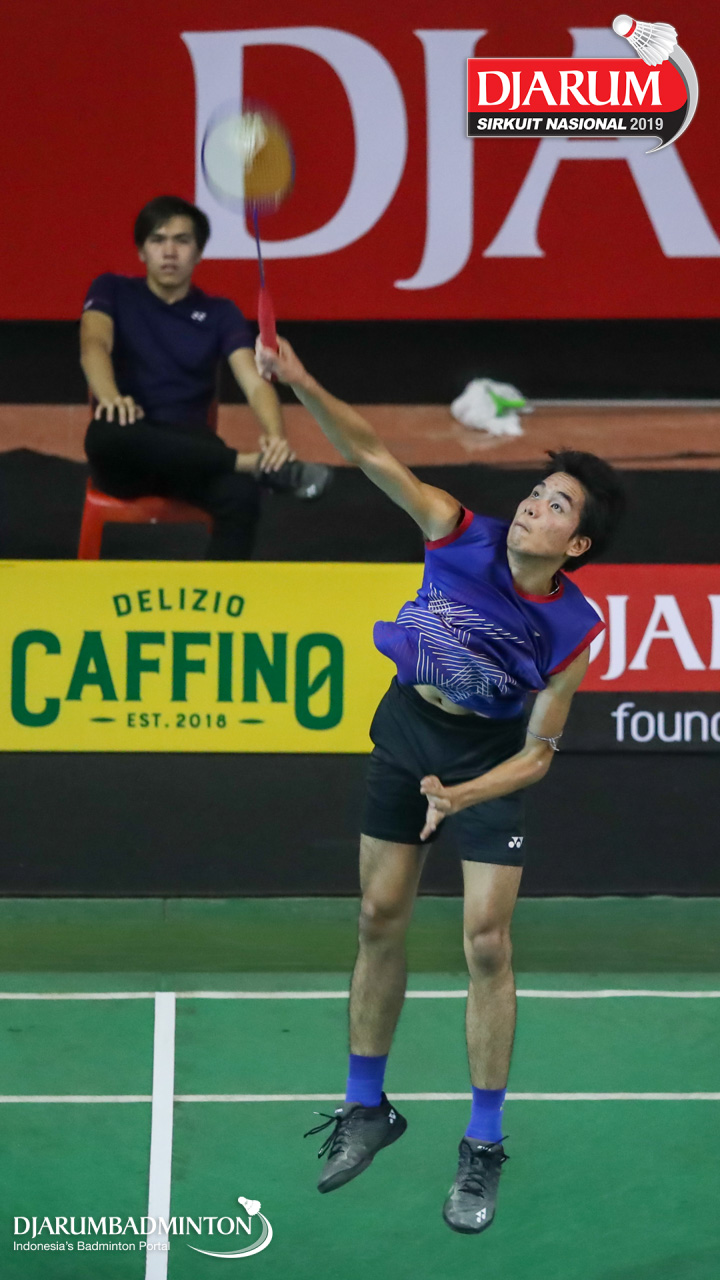 Gabriel Vincenzo Aprilio Tewuh (Bhayangkara Manado) berusaha menggapai shuttlecock