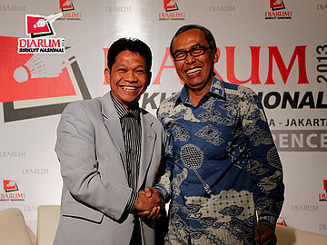 Perwakilan PBSI Manado dan Sekjen PB PBSI Kusdarto Pramono bersalaman usai menandatangani perjanjian berjalannya Djarum Sirkuit Nasional 2013.