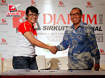 Dewi, perwakilan dari Li Ning selaku sponsor pendamping bersalaman dengan Sekjen PB PBSI Kusdarto Pramono usai menandatangani perjanjian berjalannya Djarum Sirkuit Nasional 2013.