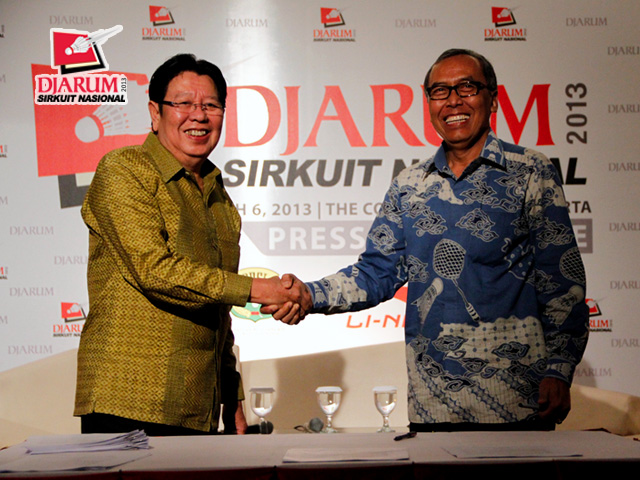 Perwakilan PT. Djarum Yan Haryadi bersalaman dengan Sekjen PB PBSI Kusdarto Pramono berfoto bersama usai menandatangani perjanjian berjalannya Djarum Sirkuit Nasional 2013.