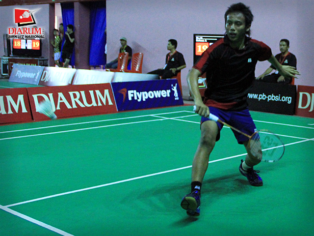 Pemain Pusdiklat Jaya Raya, Imam Adi Kusuma berusaha mengembalikan kok ke arah pemain PB. Fila Watch Makassar, Chairil Anwar dalam babak penyisihan tunggal remaja putra Djarum Sirkuit Nasional Makassar di GOR Sungguminasa, Gowa, Senin (17/10).