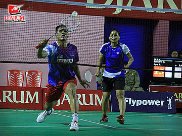 Pemain PB Djarum/SGS Elektrik PLN, Fernando K/Kesya Nurvita berusaha mengembalikan kok ke arah pemain PB Ganesha Islamic Village/ SGS Elektrik PLN, Ardiansyah/Devi Tika dalam babak semifinal ganda dewasa campuran Djarum Sirkuit Nasional Makassar, Gowa