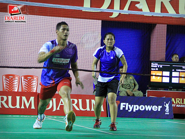 Pemain PB Djarum/PB Mutiara, Rizky Yanu/Ayu Rahmasari berusaha mengembalikan kok ke arah pemain PB Tsunami/PB Keshab, Yusuf Ahmad/Lidyawati L dalam babak semifinal ganda dewasa campuran Djarum Sirkuit Nasional Makassar,Gowa, Jumat(21/10)