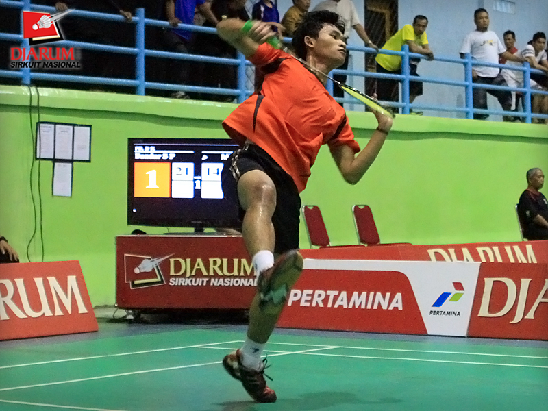 Minarki Sugito kandas di tangan Pemain PB Djarum, Bandar Sigit Pamungkas dalam laga perempatfinal Djarum Sirkuit Nasional Pangkalpinang di GOR Kacang Pedang, Kota Pangkalpinang, Kamis (22/9).