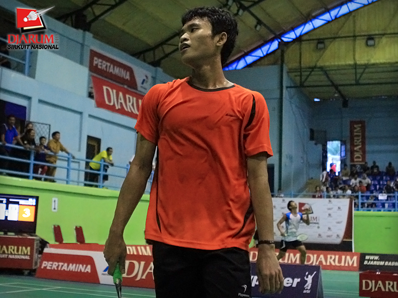 Ekspresi pemain PB. Exist, Minarki Sugito ketika berhadapan kontra pemain asal PB Djarum, Bandar Sigit Pamungkas dalam laga perempatfinal Djarum Sirkuit Nasional Pangkalpinang di GOR Kacang Pedang, Kota Pangkalpinang, Kamis (22/9).