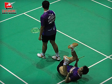 Pemain PB Djarum, Fernando Kurniawan (bawah) terjatuh ketika tengah berlaga kontra rekan setimnya di PB Djarum, Albert Saputra/Rizki Yanu Kresnayandi di babak semifinal Sirkuit Nasional Pangkalpinang di GOR Kacang Pedang, Pangkalpinang, Jumat (23/9).