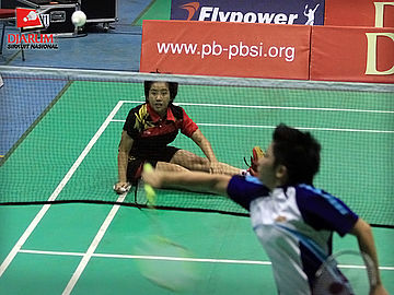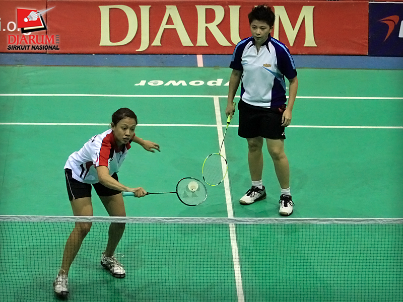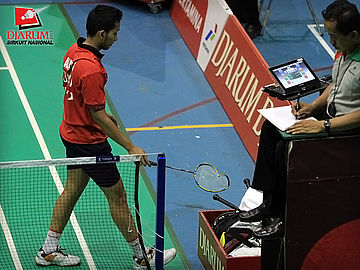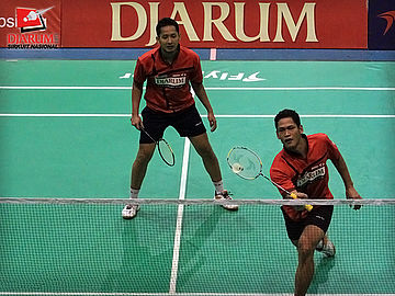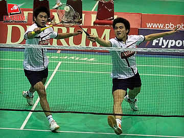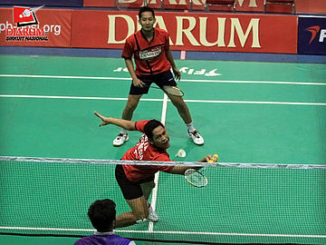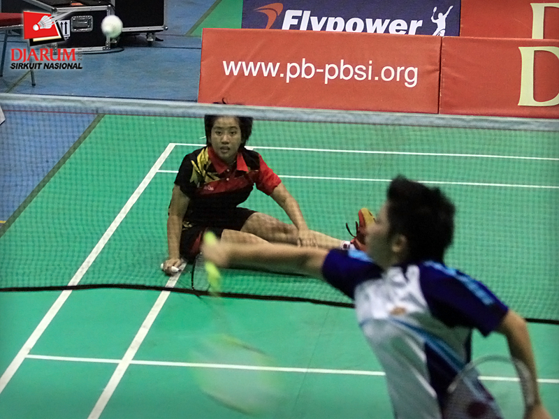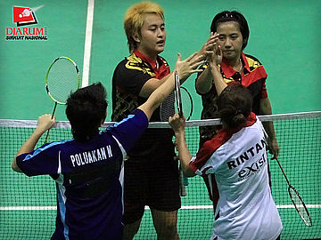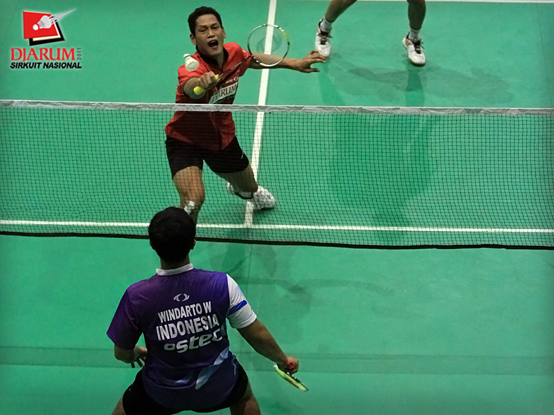 Pemain PB Djarum, Fernando Kurniawan (bawah) terjatuh ketika tengah berlaga kontra rekan setimnya di PB Djarum, Albert Saputra/Rizki Yanu Kresnayandi di babak semifinal Sirkuit Nasional Pangkalpinang di GOR Kacang Pedang, Pangkalpinang, Jumat (23/9).