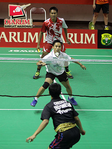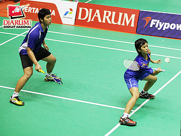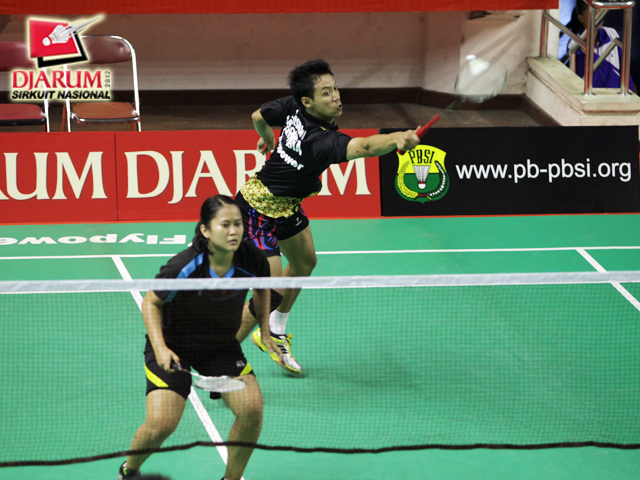 Pasangan I Putu Roy/Berliyan Sudrajat (Gemilang Surabaya/Semen Gersik) berusaha mengembalikan bola ke arah pasangan Ricky Alverino/Febriani Endar (PB Djarum Kudus).