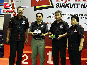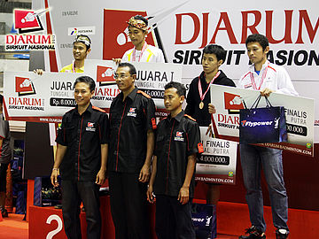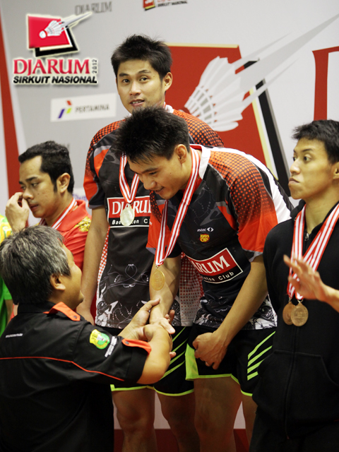 Pasangan ganda dewasa putra, Rendra Wijaya/Rian Sukmawan (PB Djarum Kudus) menerima penyematan medali emas usai keluar sebagai juara pertama.
