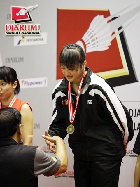 Hanna Ramadini (Mutiara Bandung) mendapatkan penyematan medali emas usai keluar sebagai juara pertama di kelompok tunggal dewasa putri setelah mengalahkan Ana Rovita (PB Djarum Kudus) di final.