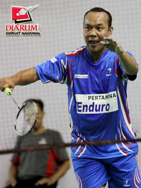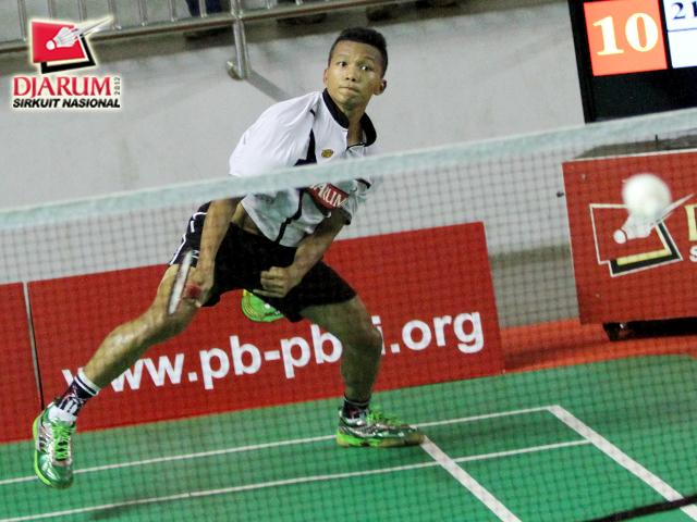 Yuda (Sarwendah) saat berusaha mengembalikan bola drop shoot yang dilepaskan Resky (PB Djarum Kudus).