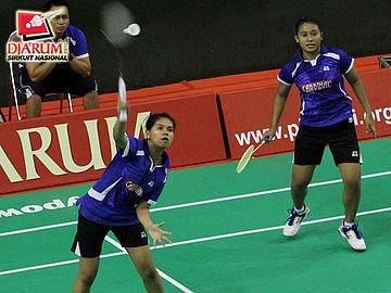 Pasangan Adinda Putri Pertiwi/ Yuanda Hemi (Tangkas Specs) sedang memukul kok untuk dikembalikan kepada pasangan Monica Ngilu/ Suci Ramadhani Lahe (Mutiara Bandung).