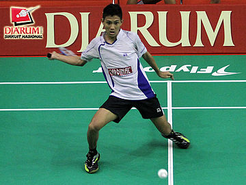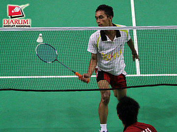 Bandar Sigit Pamungkas (Djarum Kudus) sedang mengembalikan kok kepada lawannya, I Putu Roy Danu sedang (Gemilang Surabaya).