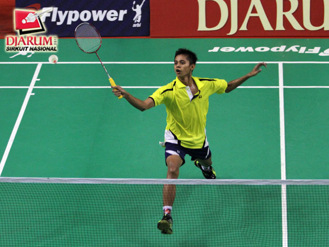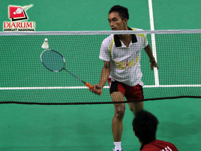 Eska Rivan Sanjaya sedang mengembalikan kok kepada lawannya, Reksy Aureza Megananda (Djarum Kudus).