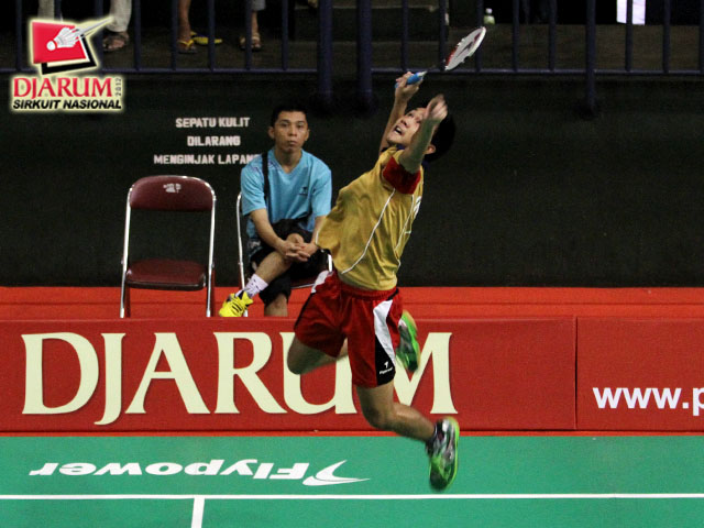 Yoga Pratama (Tangkas Specs) sedang melakukan smash jump untuk mengembalikan kok kepada lawannya, Ridho AKbar (Ganesha).