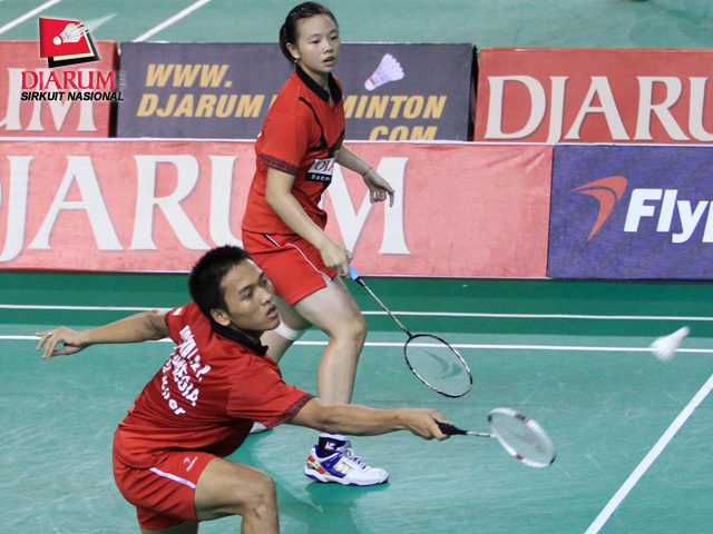 Arsya Isnanu Ardi Putra yang berpasangan dengan Della Augustia (PB Djarum) bersiap-siap untuk mengembalikan kok saat bertanding melawan Ihsan A.W / Vicya Sandra dari Guna Dharma.