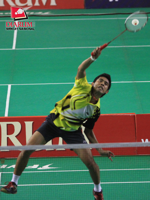 Hermansyah, pemain Jaya Raya Jakarta memukul kok dengan keras ke arah pemain Tangkas Alfamart, Gestano Ganendra.