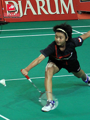 Pemain PB Djarum, Arinda Sari Sinaga sedang mengejar kok dari pemain SGS PLN Bandung, Dina Rahayu.