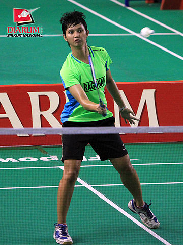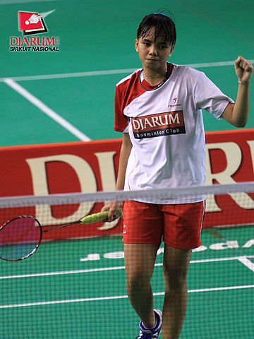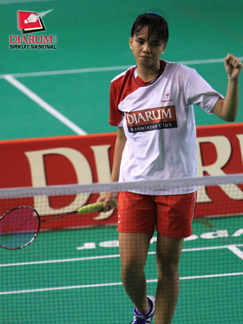 Ekspresi kepuasan Arinda Sari Sinaga dari PB Djarum ketika berhasil mencetak poin dalam pertandingan melawan Dina Rahayu dari SGS PLN Bandung. Arinda menang 21-10, 15-21, dan 21-8 atas Dina.