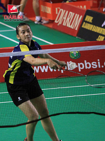 Pemain PB Djarum, Syafitri Nur Azizah sedang memukul kok saat bertanding melawan Ahsaniaty Putri dari Guna Dharma.