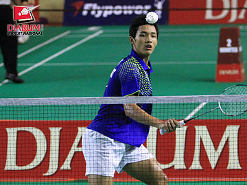 Kok yang dipukul pemain Tangkas Alfamart, Jonathan Christiie membentur net dalam pertandingan melawan pemain PB Djarum, Ihsan Maulana Mustofa.