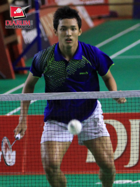 Pemain Tunggal Putra Taruna, Rico Hamdani dari Tangkas Alfamart jatuh tersungkur saat mengejar kok dari pemain PB Djarum, Ryan Fajar Satrio.