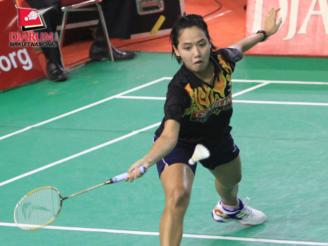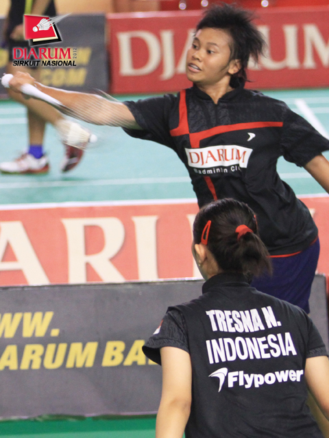 Pemain PB Djarum, Uswatun Khasanah yang berpasangan dengan Tresna Navelia C.R sedang memukul kok saat bertanding melawan pasangan Afni Fadilah/Putri Sekartaji Pungkasari dari Ragunan dalam babak perempat final Ganda Taruna Putri.