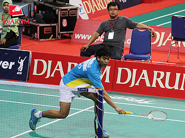 Jonathan Christie (Tangkas Alfamart Jakarta) berusaha mengembalikan kok ke arah Muh.Erwin (Arena Spirit Cirebon).
