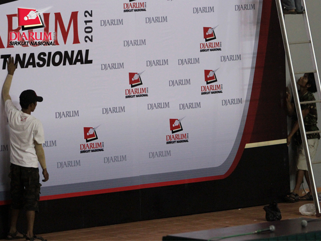 Panitia mempersiapkan backdrop Djarum Sirnas Palembang 2012 di GOR Dempo.
