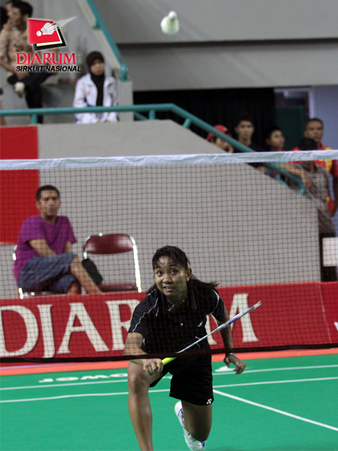 Gibertha Agnestia Suhendra yang berpasangan dengan Farah Amalia Triyani (PB Djarum) sedang berusaha mengembalikan bola dalam pertandingan melawan Ayu Wanda/Neng Wulan dari PB Exist Jakarta.