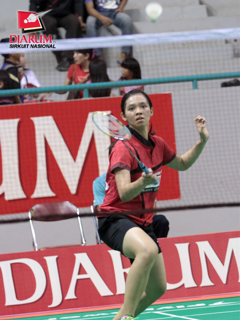 Febby Angguni sedang menunggu datangnya bola dari Rusydina Antardayu dalam pertandingan ronde kedua Tunggal Dewasa Putri yang berlangsung Kamis, (23/2) sore.