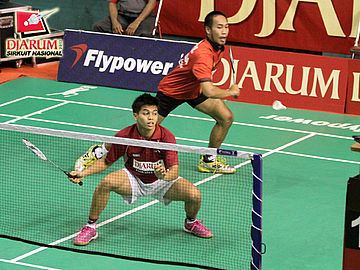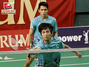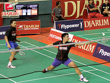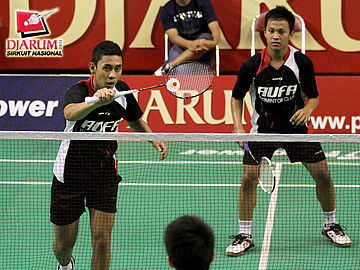 Chrisna Adi/Ridho AKbar (Ganesha) menyambut serve dari Rangga Yave/Sigid Sudrajat (PB DJarum Kudus).