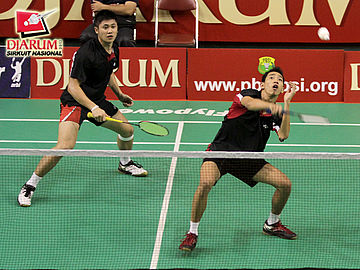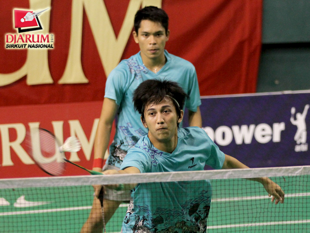 Unggulan pertama ganda dewasa putra, Rendra Wijaya/Rian Sukmawan (PB Djarum Kudus) bersiap mengembalikan bola ke arah pasangan Ade Yusuf/Wahyu Nayaka (Pelatnas).