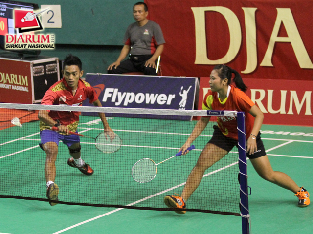 Ridho Akbar/Ery Octaviani (Ganesha/Pusdiklat Jaya Raya) nyaris berebut bola dari serangan Trikus Harjanto/Vita Marissa (Pertamina Indonesia/Tangkas Specs).