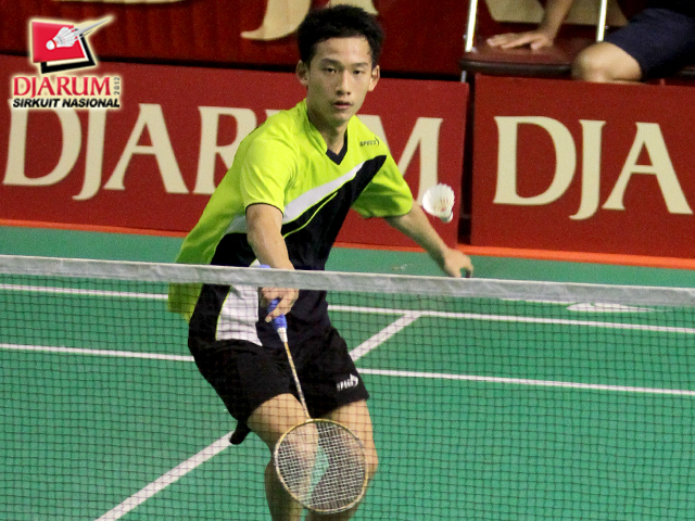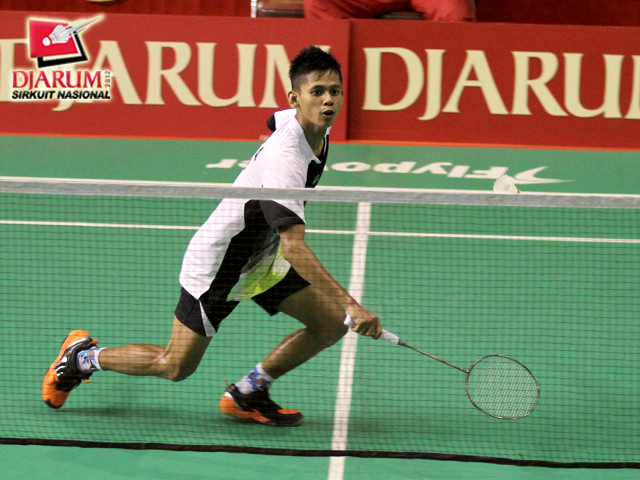 Rudi Cahyadi (PB Djarum Kudus) menyambut serve dari Gustaf Firdaus (Mutiara Bandung).