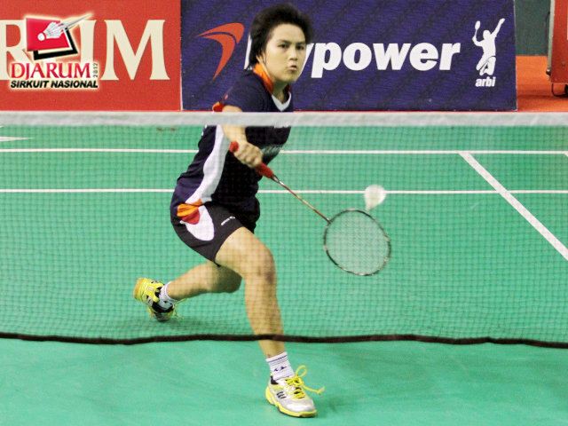 Berliyan Sudrajat (Semen Gresik) berusaha mengembalikan bola ke arah Fina Nuraena (SGS PLN).