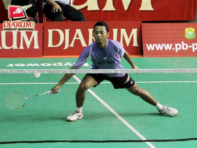 Fauzi Adnan (Jaya Raya Suryanaga) berusaha menggapai bola smash menyilang dari Panji Akbar (Pelatnas).