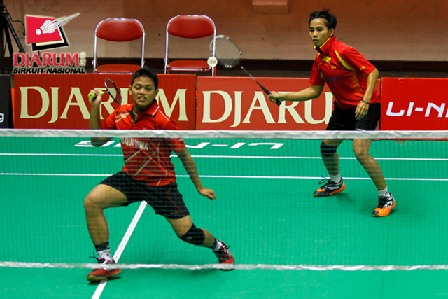 Calvin Ryan Mamonto (PB Djarum) mengembalikan shuttlecock ke arah M. Ahdial (Pelatprov DKI Jakarta).