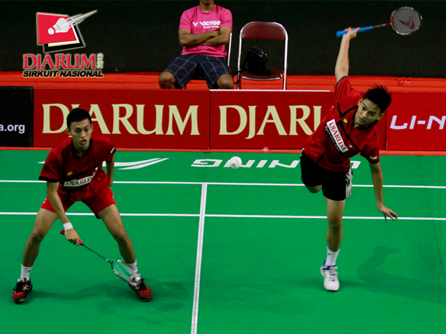 Abu Bakar / Tedi Supriadi (Djarum Kudus) mengembalikan smash lawan.