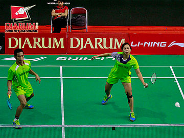 Abu Bakar / Febriani Endar Kusumawati (Djarum Kudus) bersiap mengembalikan kok ke arah Rafli Rizky Ristian / Tri Okta Shelina (Mutiara Bandung).