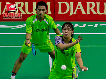 Faisal Ramadhan / Mita Sani Pratiwi mengembalikan kok ke arah Aldo Abdillah / Desaula Gendy (Jaya Raya Jakarta).