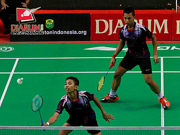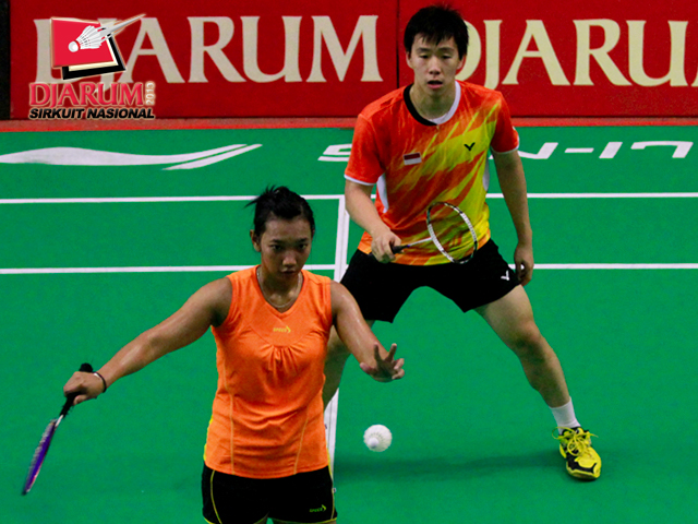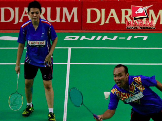 Trikusharjanto/ Vita Marisa (Pertamina Indonesia/Djarum Kudus) menyambar serve Marcus Fernaldi Gideon/Endang Nursugianti (Tangkas Specs).