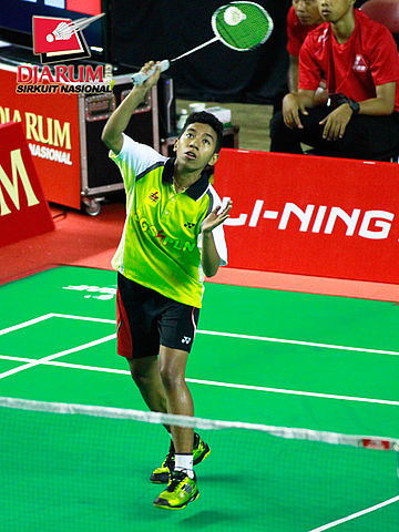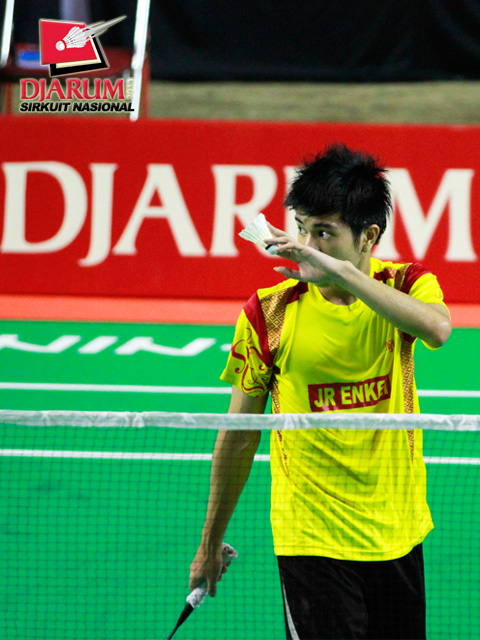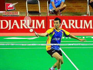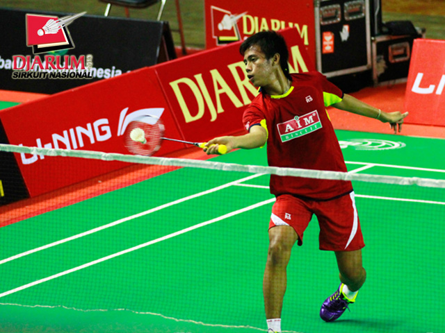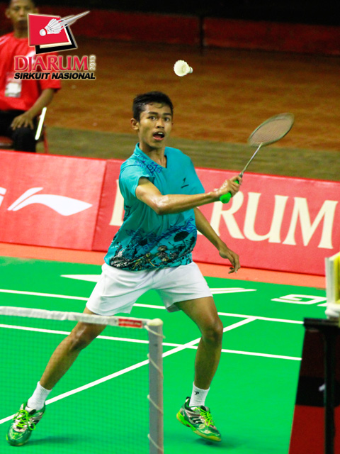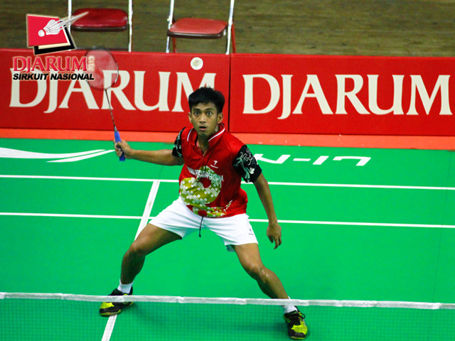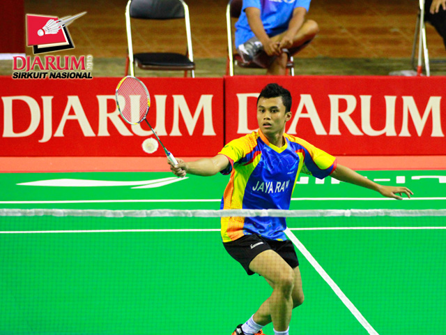 Revindra Rayhaldi (PB Djarum) mengembalikan kok ke arah Agil Wahyudi (Jaya Raya Metland).